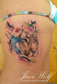 侧腰狮子泼墨彩色纹身图案