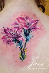 背部小清新百合花彩色泼墨花卉纹身图案
