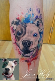 小腿狗彩色泼墨纹身图案