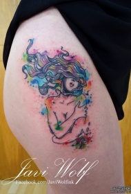 大腿性感彩色泼墨女郎纹身图案