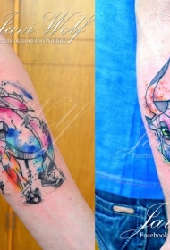 小臂彩色泼墨牛头和人物纹身图案