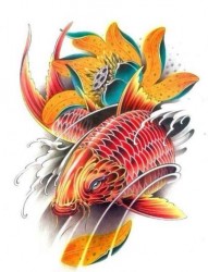 彩色鲤鱼和莲花的组着纹身手稿