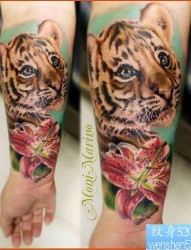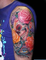 手臂彩色骷髅玫瑰上帝之眼纹身图案