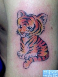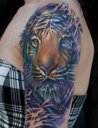 纹身520图库提供一款女性大臂彩色老虎纹身图案
