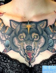 一款胸口彩色狼纹身图案