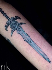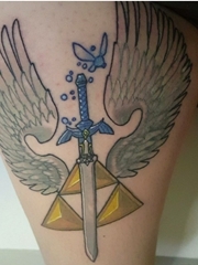 大腿上彩色的黑曜石和剑和天使翅膀纹身图片