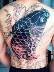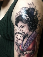 个性女生背部彩色骷髅女郎扇子纹身图案