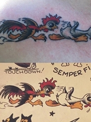 男性右肩膀上可爱的彩色公鸡追鸭子纹身图片