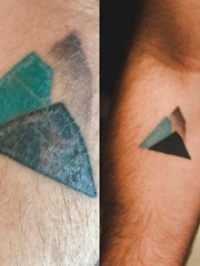 女子左手大臂上漂亮的彩色宠物猫纹身图片
