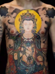 女性右后肩背上彩色的噬魂者的刀纹身图片