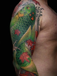 大臂鲜艳夺眼的绿色鲤鱼纹身图案
