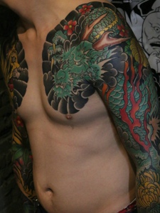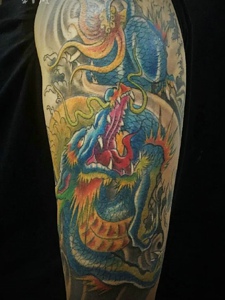 大臂色彩鲜艳的邪龙纹身图案很帅气