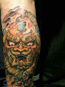 包小腿传统彩色天降雄狮纹身图案