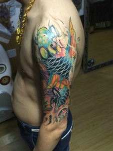 大臂精致漂亮的彩色鲤鱼纹身图案