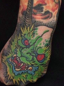 遮盖整个手背的彩色邪龙纹身图案