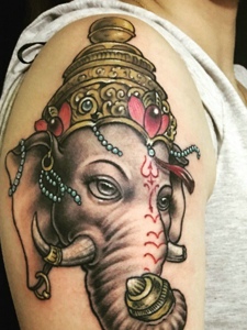 精致十足的大臂彩色象神纹身图案