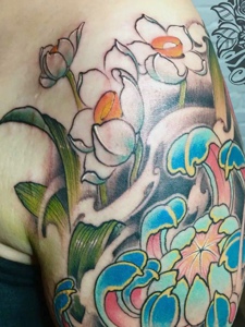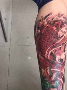 如来佛与鲤鱼结合的满背彩色纹身图案