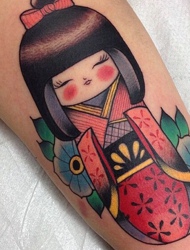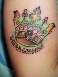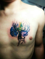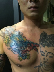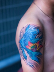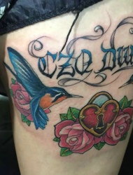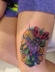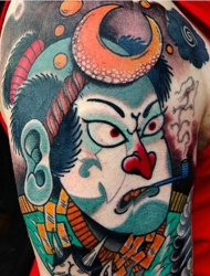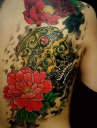遮盖着半个背部的彩色骷髅和花朵纹身