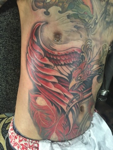 遮盖着整个胸前的彩色凤凰纹身