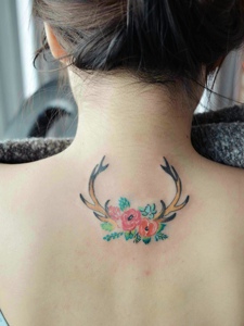 时尚女生钟爱的背部彩色羊角纹身