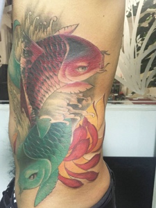 落在侧腰部的两条彩色大鲤鱼刺青