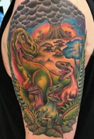 德国恐龙纹身 男生大臂上彩色的恐龙世界纹身图片