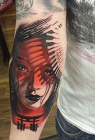日本艺妓纹身花臂 男生手臂上彩色的艺妓纹身图片