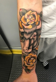 公牛图腾纹身 男生手臂上黄玫瑰和牛纹身图片