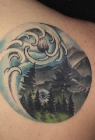纹身风景 男生后背上彩色的山脉风景纹身图片