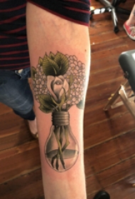 手臂纹身素材 男生手臂上花朵和灯泡纹身图片