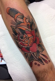 枪炮玫瑰纹身 男生手臂上匕首和玫瑰纹身图片