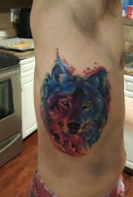 纹身侧腰男 男生侧腰上彩色的狼头纹身图片
