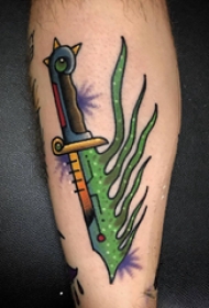 欧美小腿纹身 男生小腿上彩色的匕首纹身图片