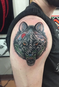 大臂纹身图 男生大臂上风景和熊纹身图片