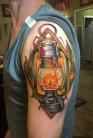 大臂纹身图 男生大臂上彩色的煤油灯纹身图片