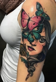 双大臂纹身 女生大臂上彩色的玫瑰纹身图片