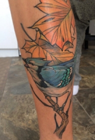 欧美小腿纹身 男生小腿上枫叶和小鸟纹身图片