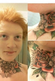 颈部纹身设计 男生颈部彩色的玫瑰纹身图片