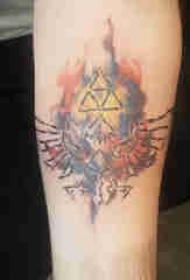 手臂纹身素材 男生手臂上彩色的三角形和符号纹身图片