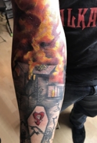 手臂纹身素材 男生手臂上建筑物和火焰纹身图片