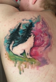 后肩纹身 男生后肩上彩色的狼纹身图片