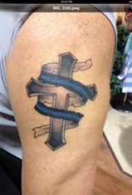 纹身小十字架 男生大臂上彩色的十字架纹身图片