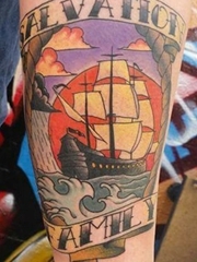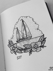 school欧美手帆船海浪玫瑰纹身图案手稿