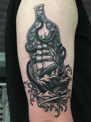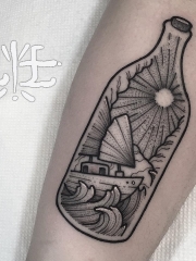 小腿欧美点刺瓶子海浪帆船纹身图案