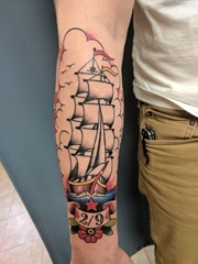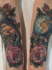 手臂欧美school帆船玫瑰地球仪纹身图案