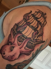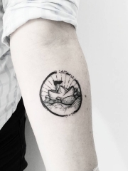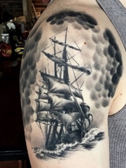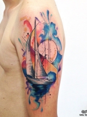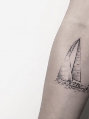 男性右手臂黑色水墨风格纹身小帆船纹身图片