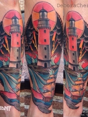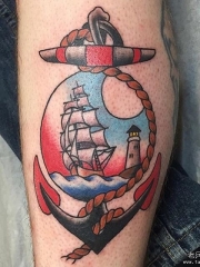 小腿彩绘船锚帆船欧美灯塔纹身图案