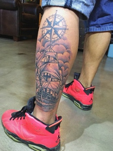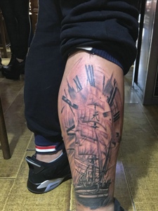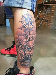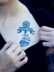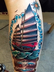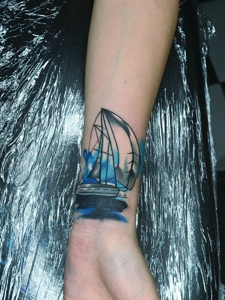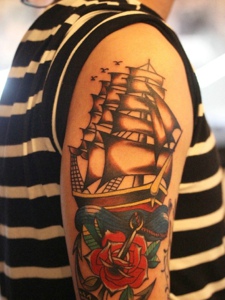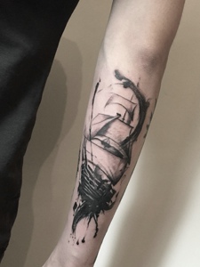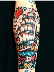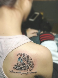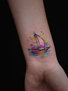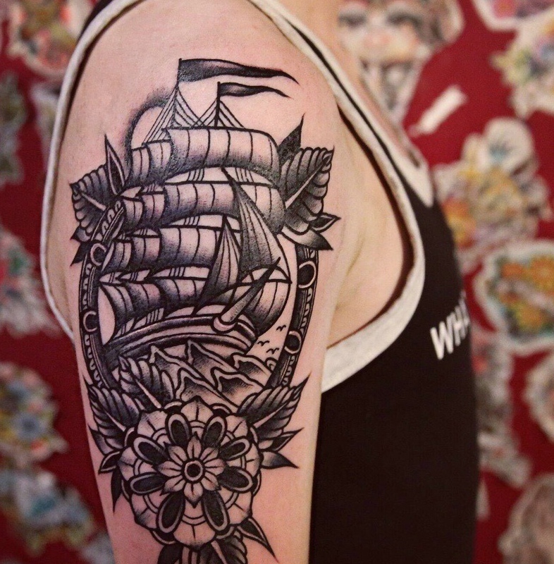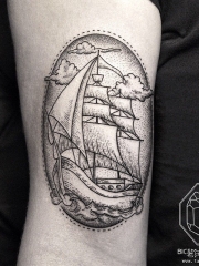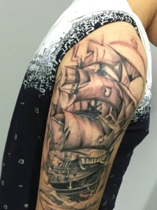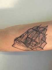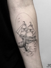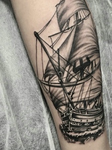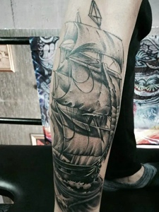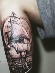 手大臂膀上漂亮的黑灰色帆船纹身图片