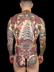 男子满背传统风格花和帆船图案纹身+++满背,男人,男性,男生,帆船,传统