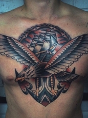男子满胸帅气的传统风格船锚帆船和老鹰纹身图片